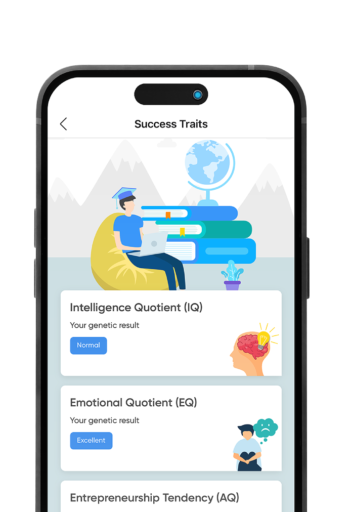 Success Traits refer to your genetic tendencies related to cognitive skills, personality, behavior, and even musical and learning abilities. CircleDNA analyzes your DNA for markers linked to traits such as psychological resilience, learning potential, and emotional regulation—helping you and your family unlock strengths and direct personal or academic growth.