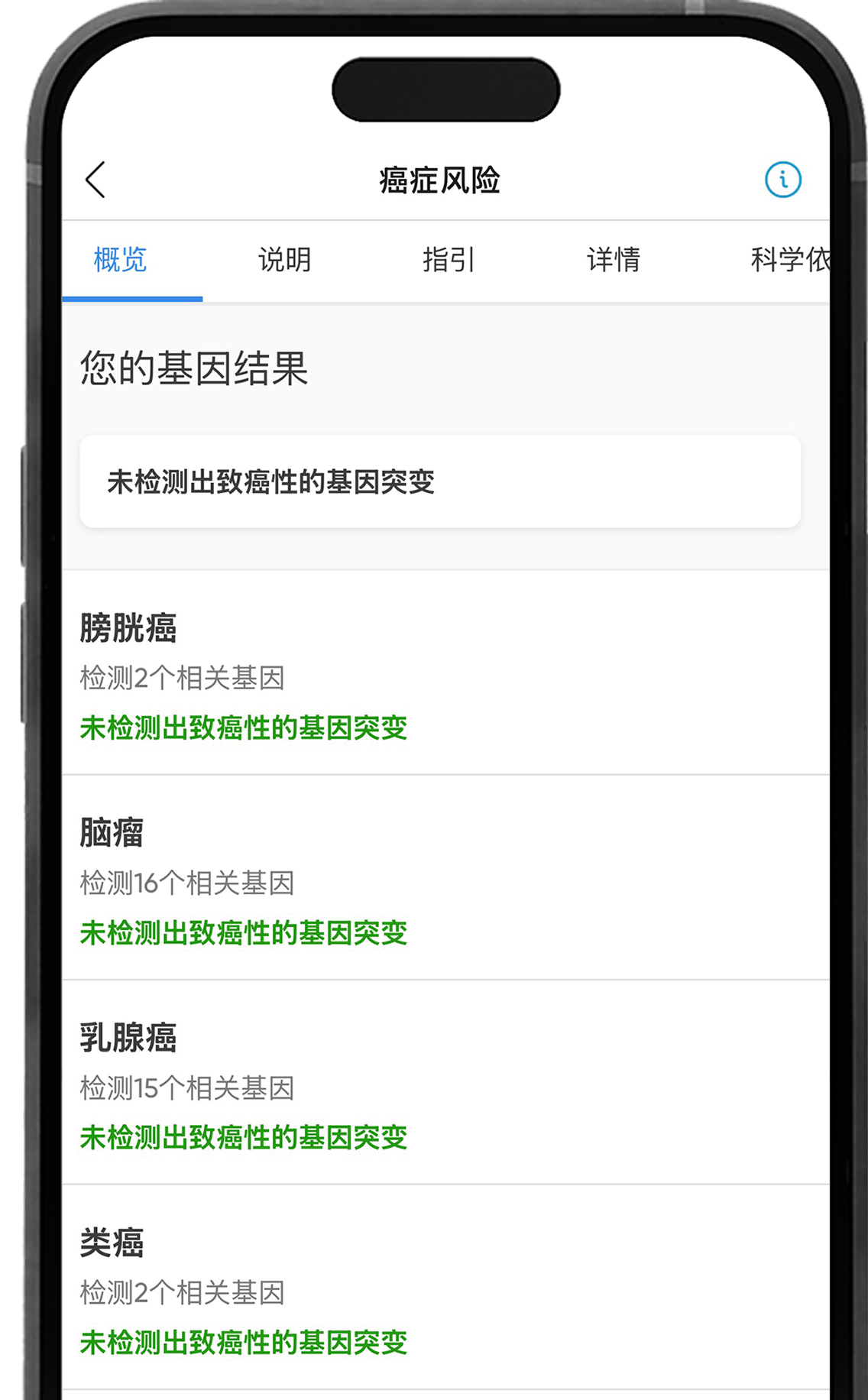 您的报告将提供明确、可行的个人化风险洞察,帮助您采取预防措施,像是生活方式调整、定期检测,或与您的医疗服务提供者共享结果。