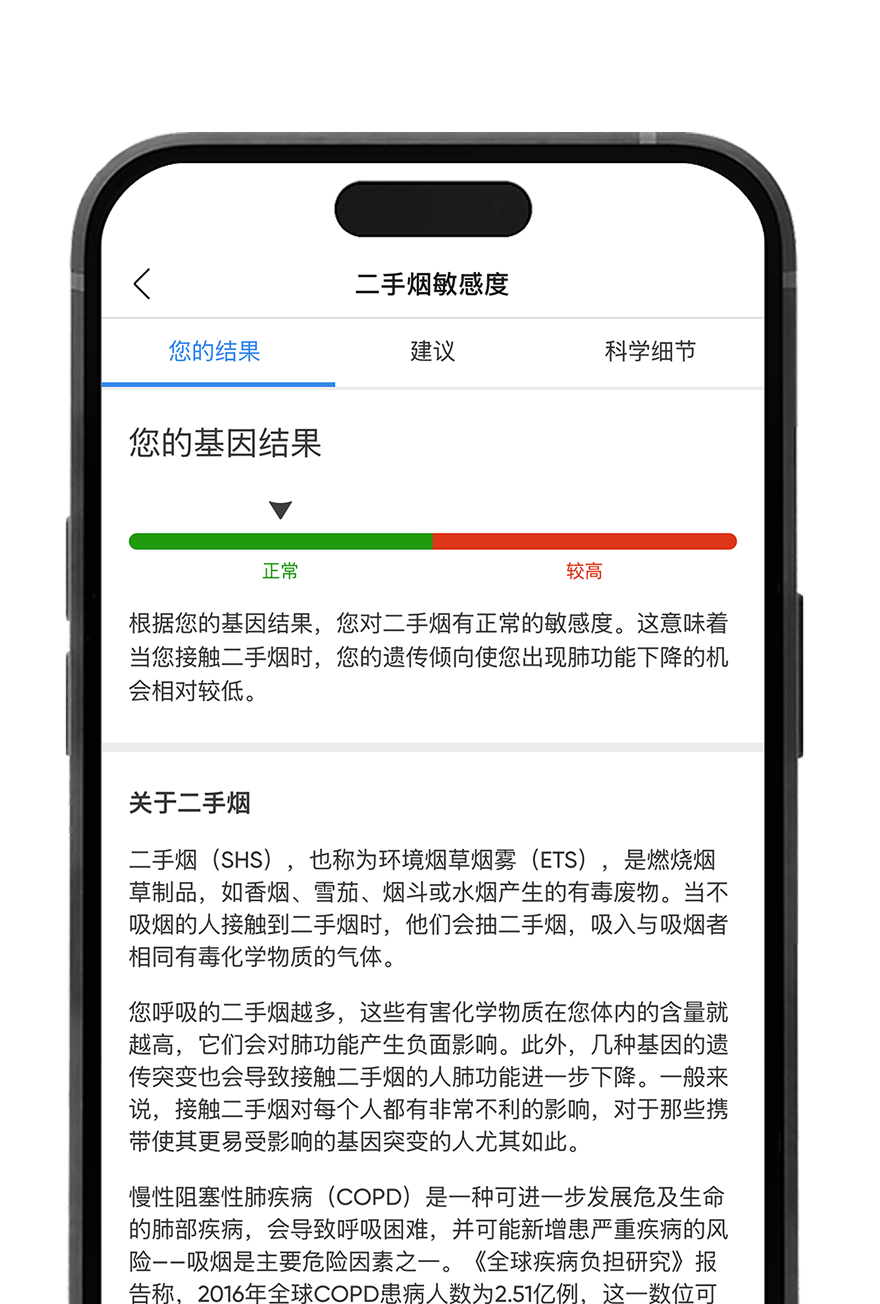 无论是有关饮食、运动还是疾病风险的见解,基因只是拼图的一部分。环境以及生活方式选择对基因的表现也有很大影响。例如,您可能有某种疾病的遗传倾向,但您可以采取积极措施来预防或管理特定症状。另一方面,您可能在基因上有耐力运动的倾向,但如果没有适当的训练,您可能永远不会成为一名顶尖的跑步健将! CircleDNA 的设计旨在通过更好地了解您的基因来帮助您发挥潜力,但重要的是要记住,由于环境和生活方式因素的影响,您的结果有时可能与您的期望有所不同。