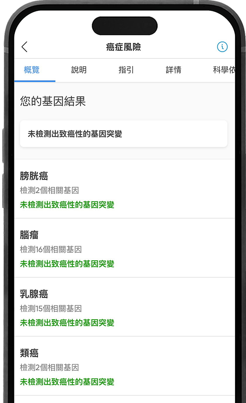 您的報告將提供明確、可行的個人化風險洞察,幫助您採取預防措施,像是生活方式調整、定期檢測,或與您的醫療服務提供者共享結果。