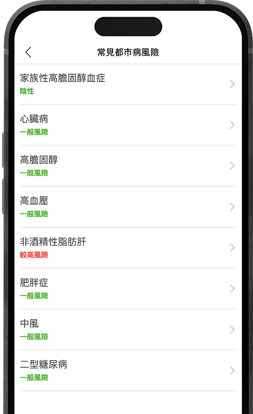 如果您的報告顯示任何疾病風險,我們將提供清晰、可行的建議,針對您的結果量身定制行動方案。我們還提供一次免費的 30 分鐘基因諮詢服務,專業顧問將與您一起檢視結果,並討論基於科學證據的預防與風險管理措施。