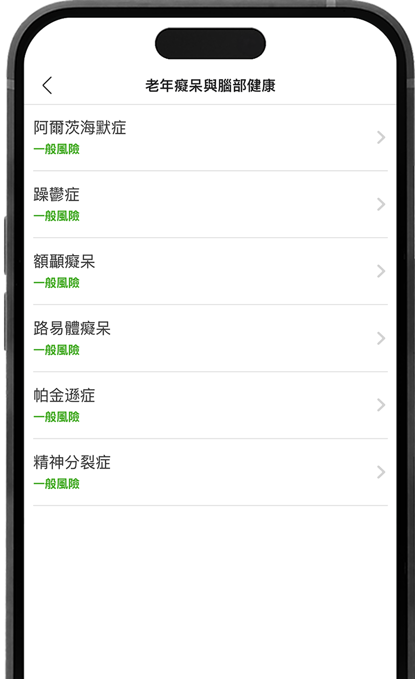 CircleDNA 測試能讓您全面了解遺傳性健康風險。透過我們先進的 NGS 技術,您將獲得關於多種疾病的基因傾向洞察,包括癌症、心臟病、阿茲海默症和帕金森氏症等神經疾病、常見都市病,以及許多罕見的遺傳性疾病。