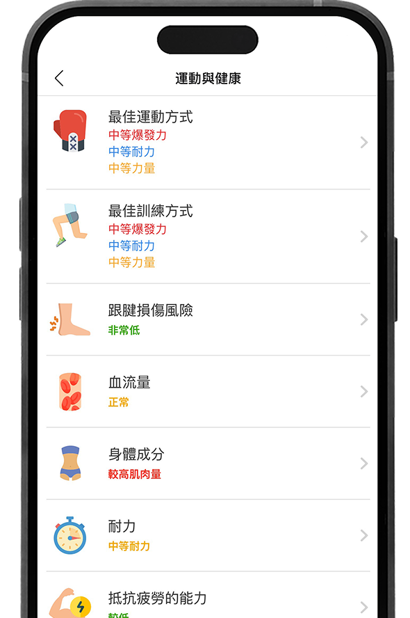 您的檢測結果將基於您的基因組成,提供有科學依據的建議,例如哪些運動類型最適合您,或需要額外補充哪些營養素。雖然我們的洞察會引導您做出選擇,但我們始終鼓勵您與醫療或健身專業人員進行討論,以獲得最佳結果。