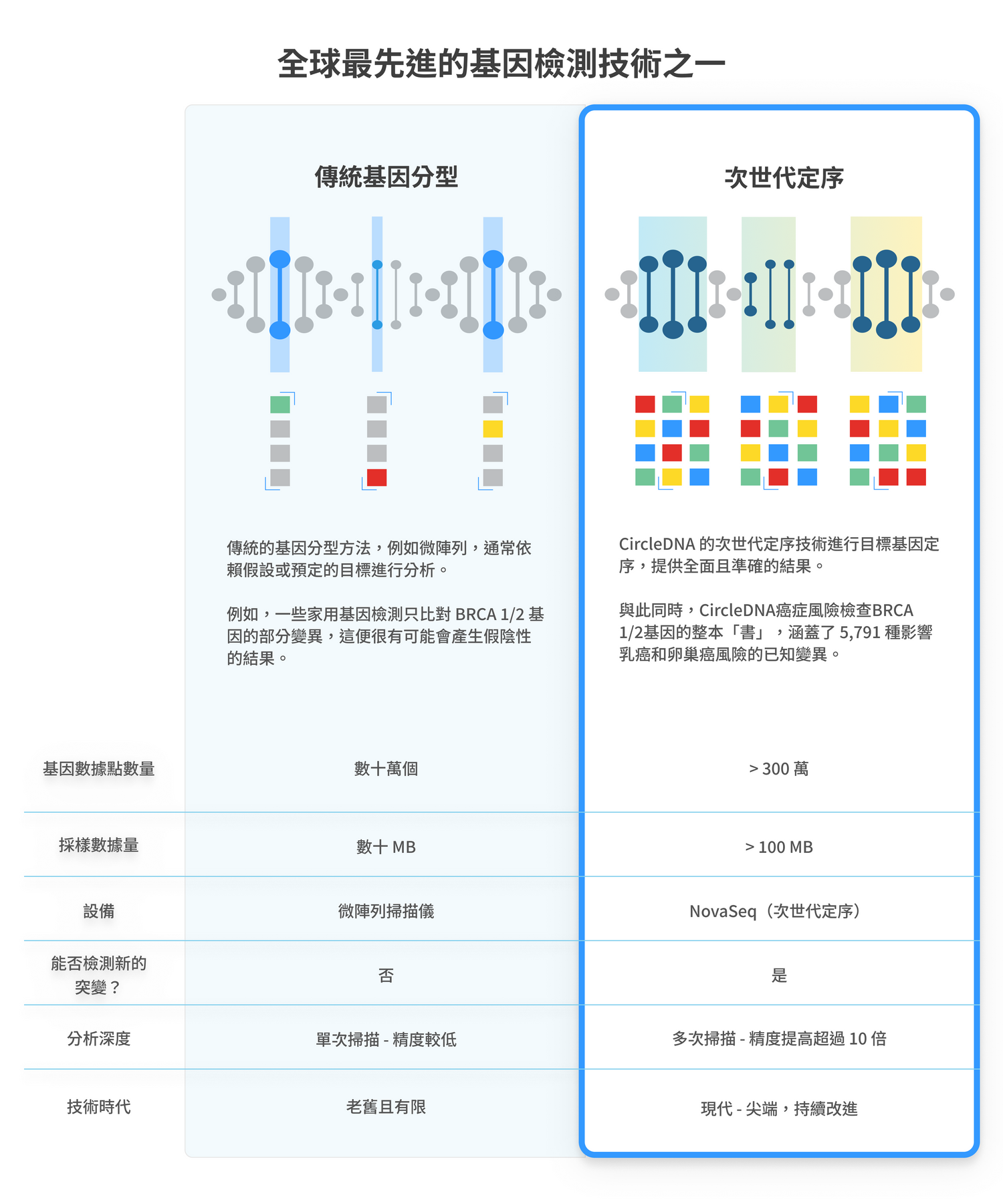 CircleDNA 透過其全方位的 DNA 健康篩檢方法,在市場上其他基因測試中脫穎而出。與主要關注祖源或飲食而已的傳統 DNA 測試不同,CircleDNA 提供超過 500 份有關您健康的詳細報告。這些報告涵蓋疾病風險到生活方式建議,為您的健康提供全面的視角。傳統的基因分型技術(如微陣列)分析數十萬個基因數據點。相反,CircleDNA 採用次世代定序(NGS)技術,涵蓋超過 300 萬個數據點,並包括更精確的序列分析。這種先進的方法使您的基因構成能夠得到更詳細和準確的評估。NGS的一個關鍵優勢是其能夠檢測傳統基因分型方法可能忽略的未知基因變異。通過利用 NGS,CircleDNA 確保不會錯過任何重要的健康見解,使我們能夠為您提供更全面的基因傾向理解。由於執行 NGS 分析和維持更高水準的報告完整性以獲得我們的健康洞察所需的大量投資,這項尖端技術的成本確實較高。在 CircleDNA,我們優先以最實惠的價格提供最好的技術。